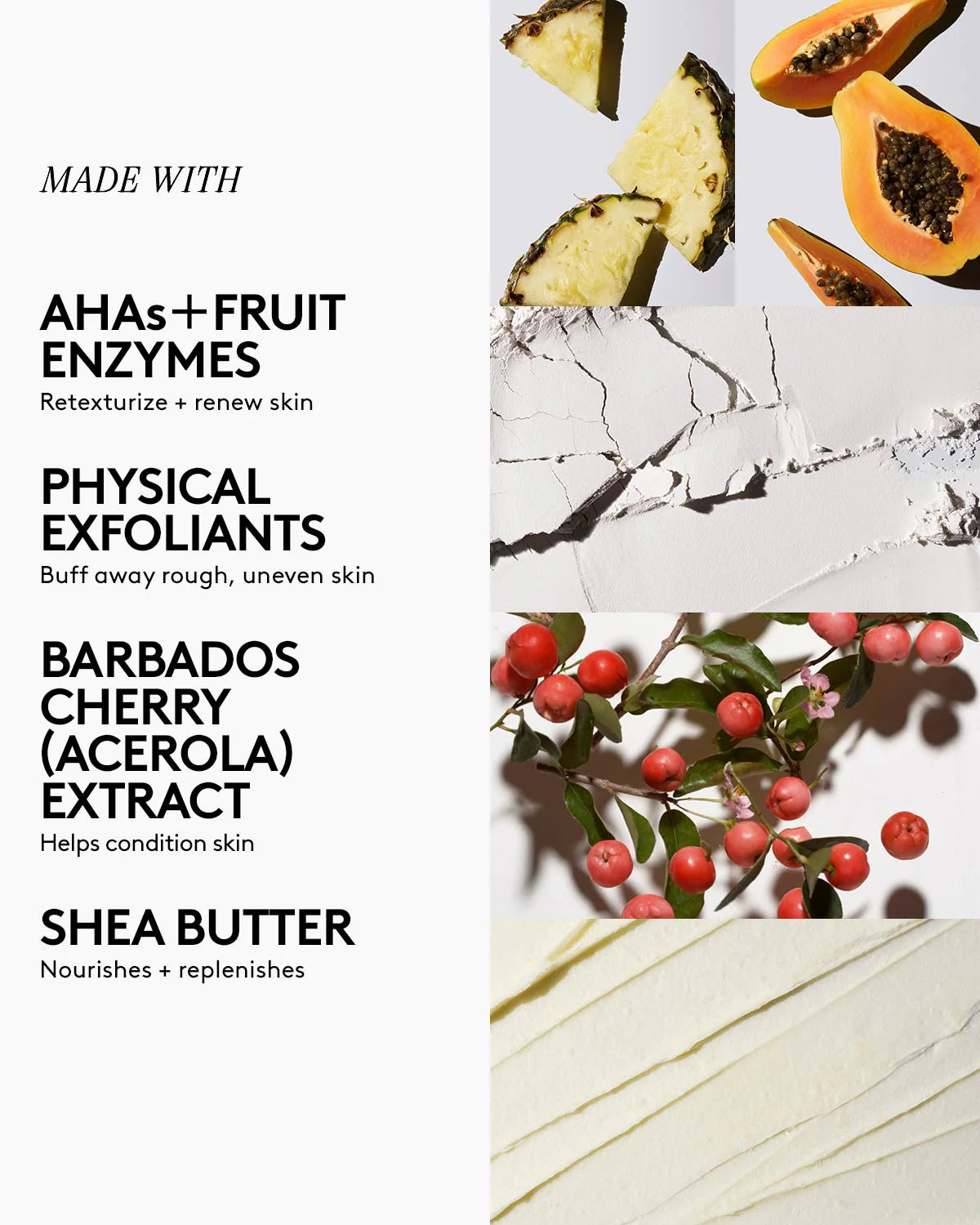 The Barbados Cherry banger for unimaginably soft, smooth skin. Powered by AHAs, fruit enzymes and sugar, this triple action scrub retexturizes, smooths and conditions from head to toe for a totally renewed glow.
