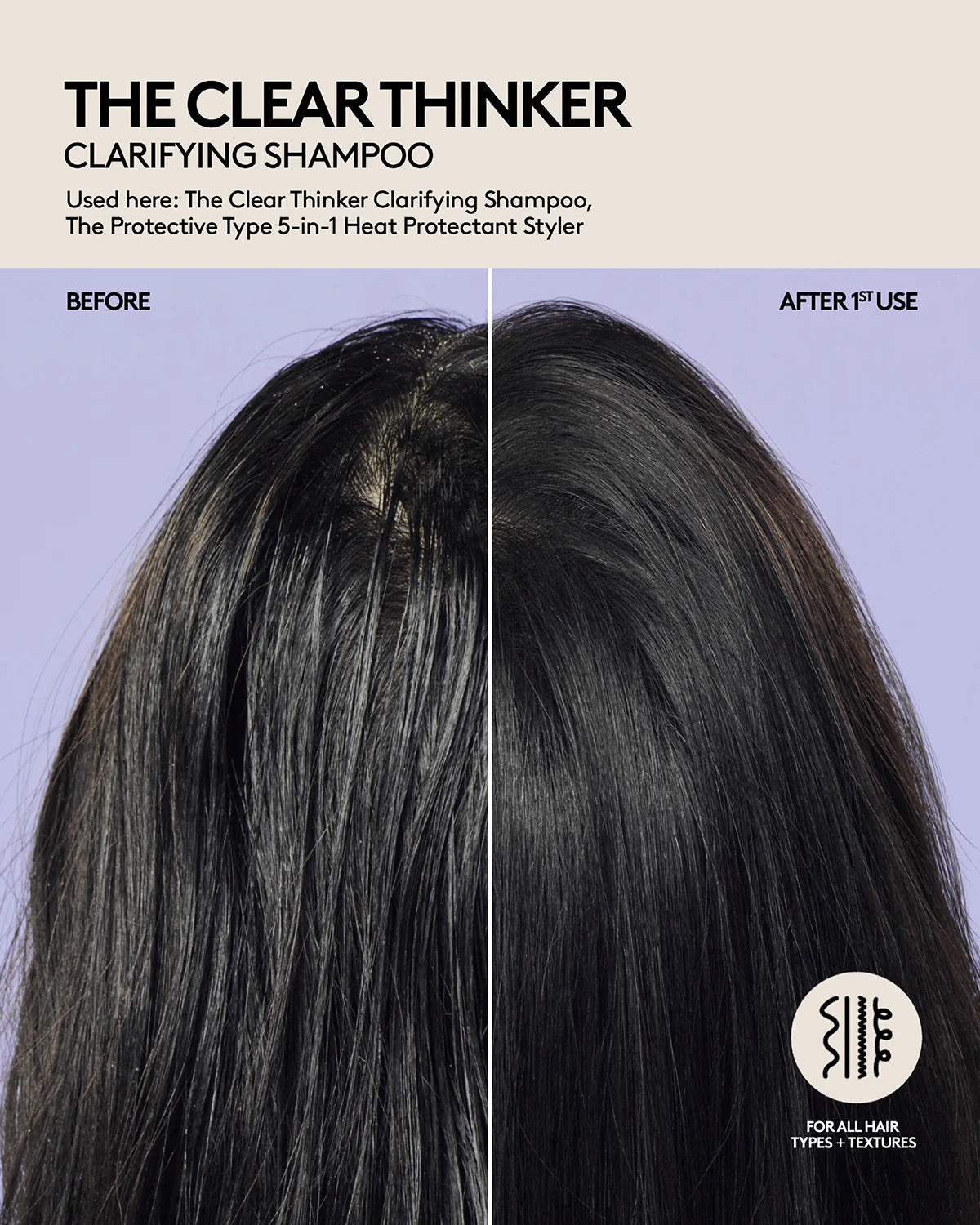 The Clear Thinker Clarifying Shampoo is ideal for all hair types and textures that experience excess product buildup, oily or dull, lifeless strands.