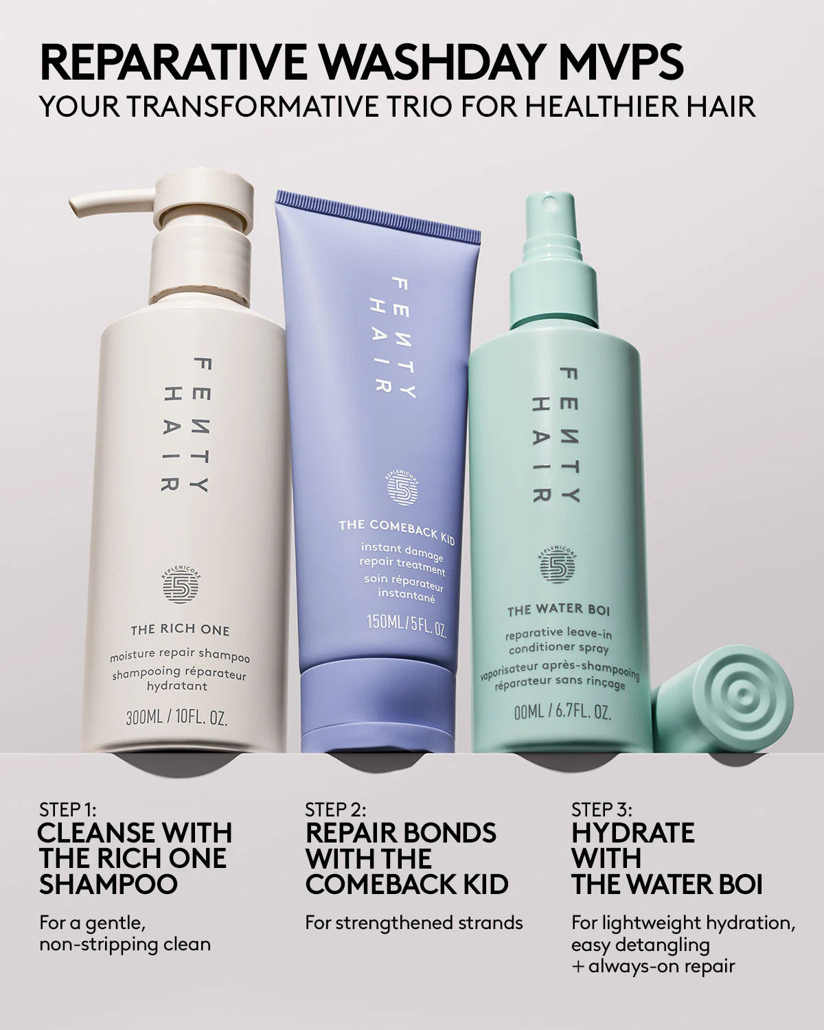 The Comeback Kid is an in-shower bond-repair treatment formulated to mend broken bonds and strengthen strands. The Water Boi Reparative Leave-In Conditioner Spray is a leave-in conditioner that hydrates, detangles, smooths frizz, softens and refreshes strands.